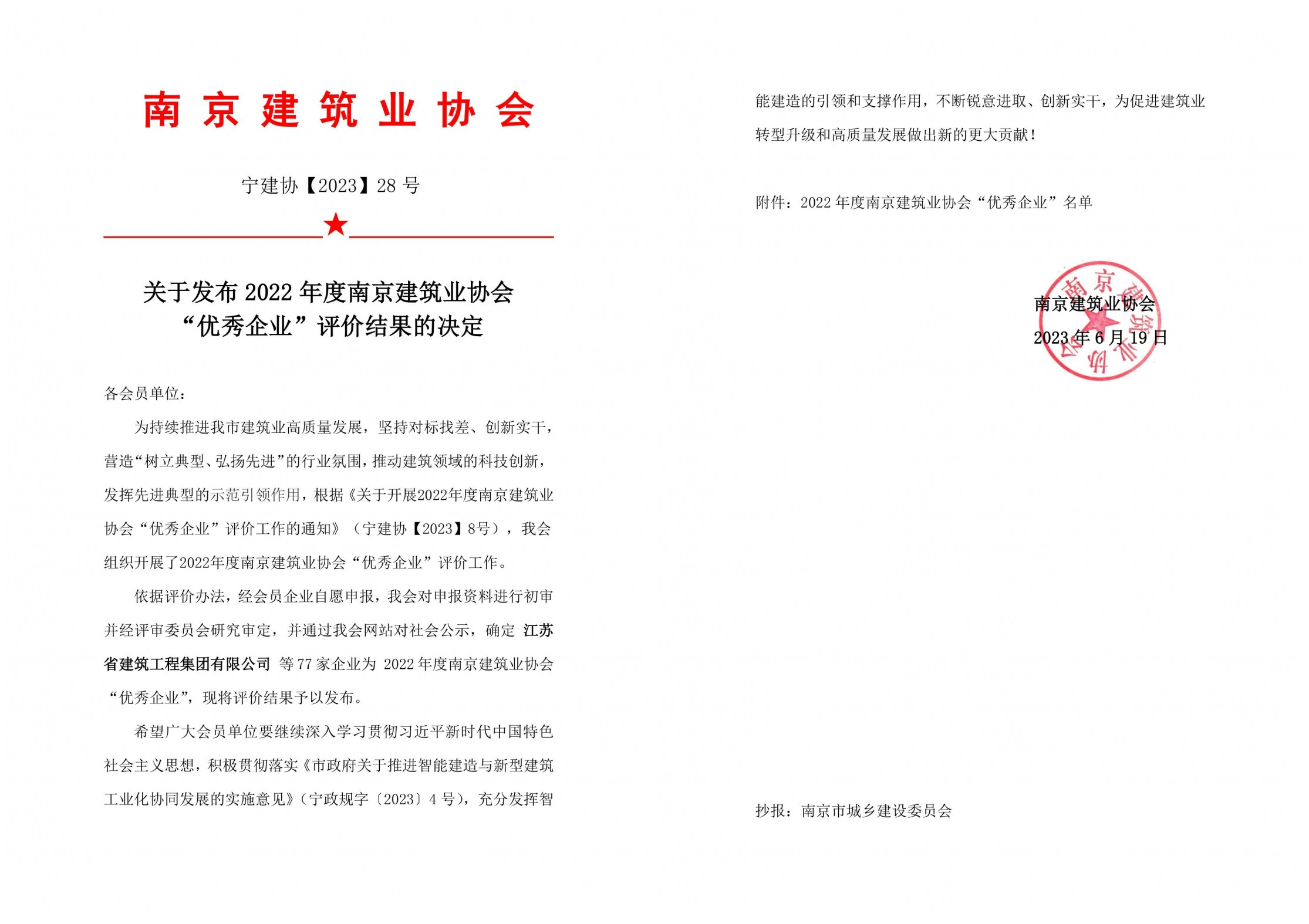 喜訊:江蘇省住建集團(tuán)榮獲2022年度“南京建筑業(yè)協(xié)會(huì)優(yōu)秀企業(yè)”稱號(hào)!