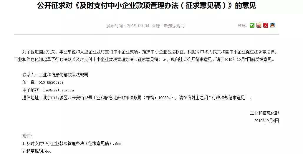 9月4日,工信部發(fā)布《及時(shí)支付中小企業(yè)款項(xiàng)管理辦法(征求意見稿)》,對(duì)國(guó)家機(jī)關(guān)、事業(yè)單位和大型企業(yè)支付中小企業(yè)款項(xiàng)的相關(guān)問題進(jìn)行明確。